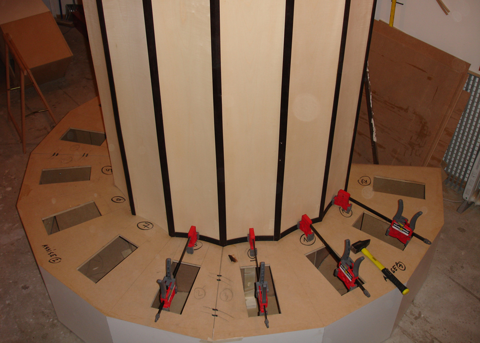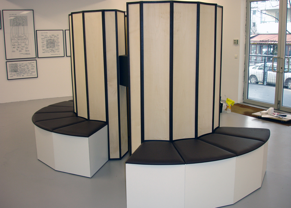 Réalisation d’après les plans de l’artiste d’une sculpture en médium. Habillage en placage bois naturel, stratifié blanc. Réalisation des assises en mousse recouverte de cuir. Baguettes en hêtre sur mesure. Structure démontable en sept éléments transportables.