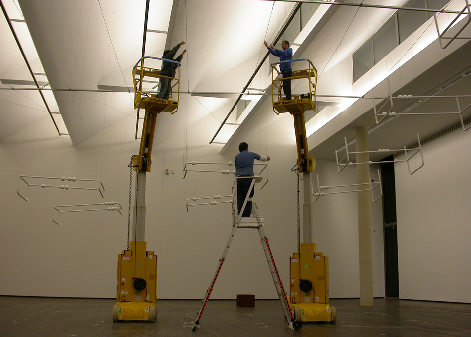 Assemblage au sol des lits pré-construits, suspension de l’ensemble des lits sur une résille constituée de rails « halfen » et de câbles acier, mise en place des vasques selon les plans de l’artiste, câblage et réglage de l’installation lumineuse et sonore.