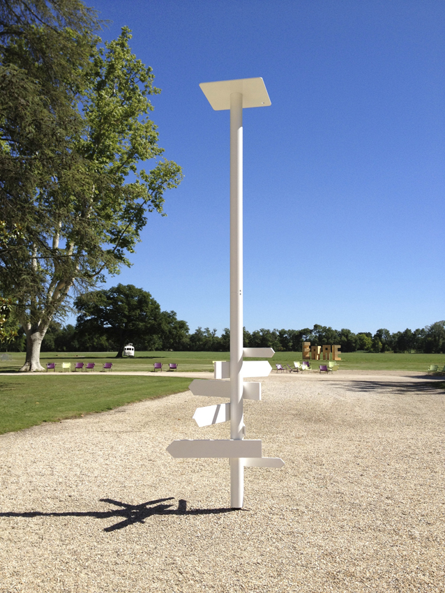 Réalisation d’une sculpture en acier démontable d’une hauteur de 5 m. Réalisation d’une maquette à l’échelle une pour validation avec l’artiste. Réalisation des panneaux en acier plié et électrosoudé. Réalisation des systèmes de fixation invisible. Sablage, métallisation et thermolaquage blanc mat.