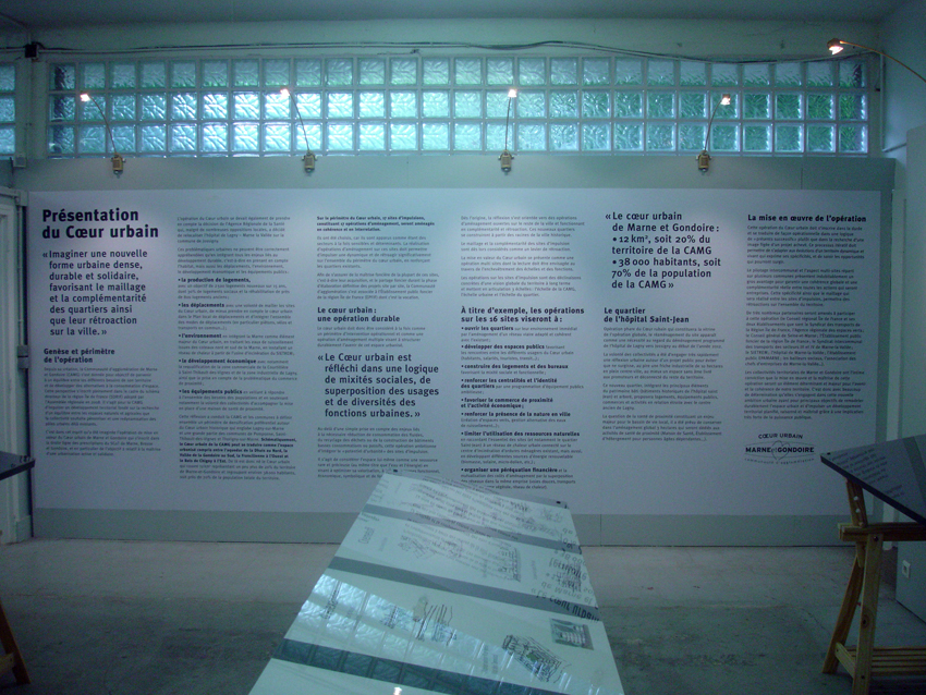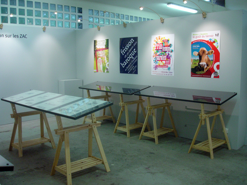 Conception et réalisation de la scénographie. Construction des cimaises. Réalisation du mobilier d’exposition. Mise en peinture. Réalisation de l’éclairage. Pose du papier-peint et des adhésifs. Accrochage des différents éléments de l’exposition.