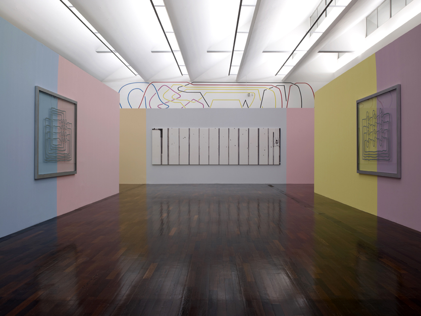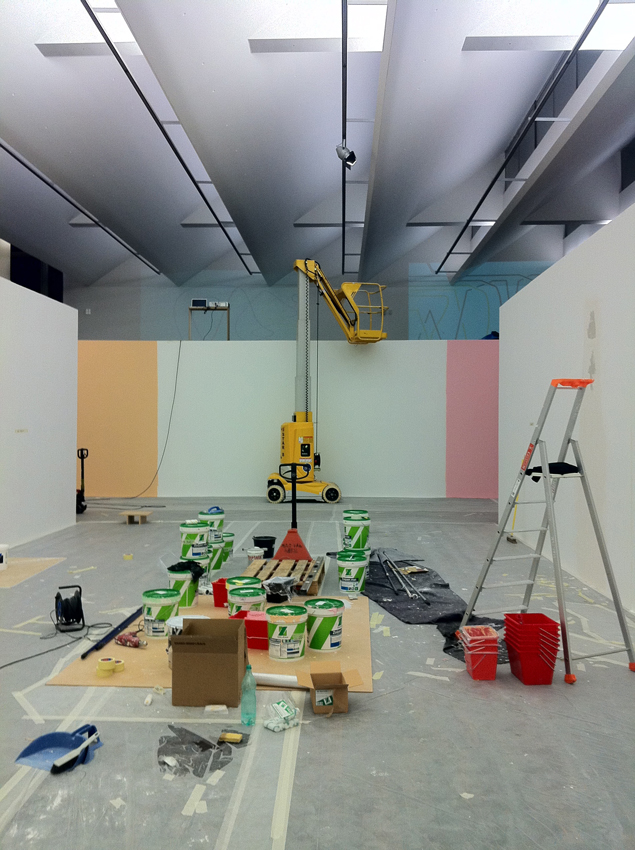 Mise en peinture de l’exposition. Réalisation des peintures murales. Accrochage des œuvres.