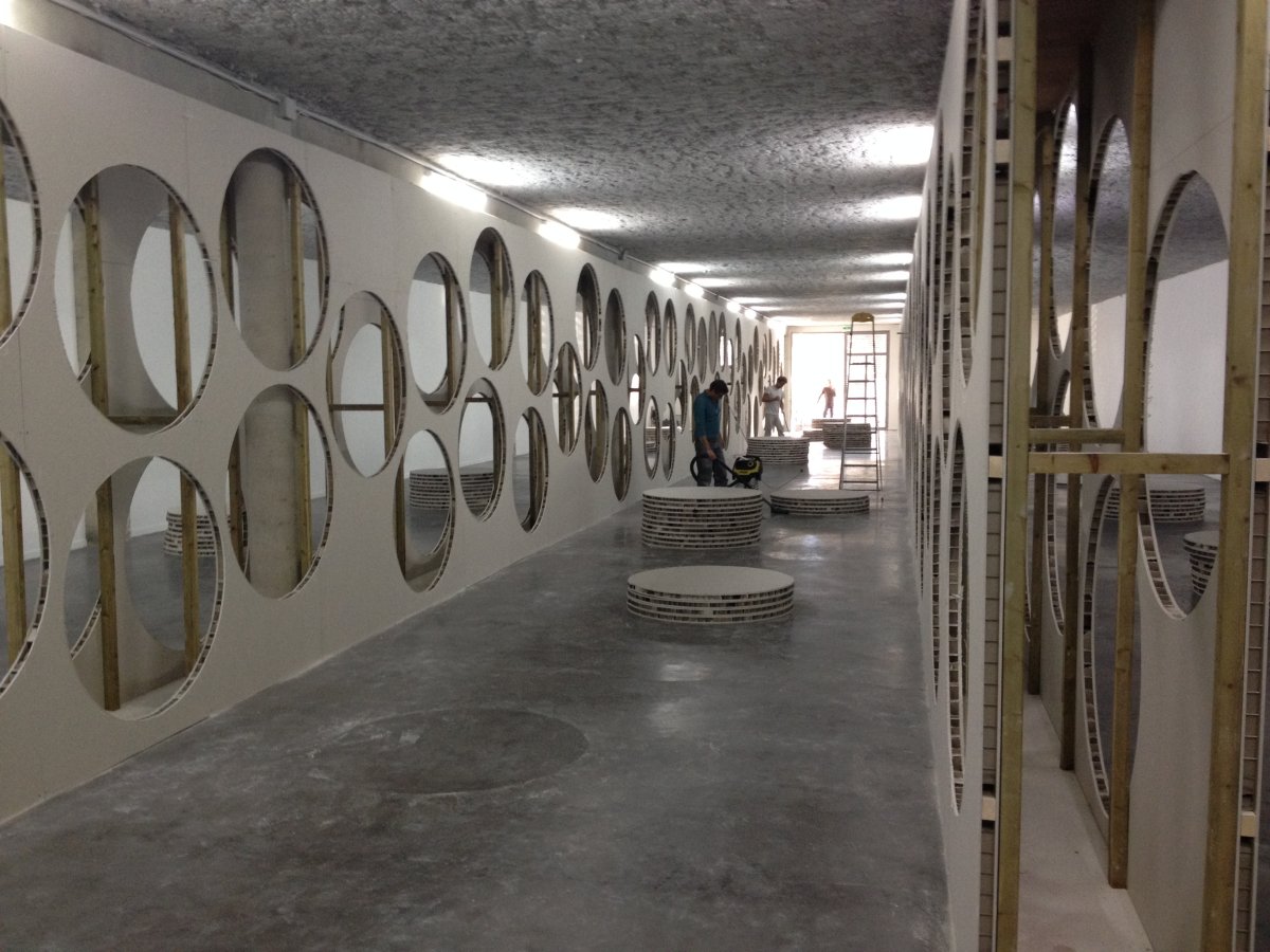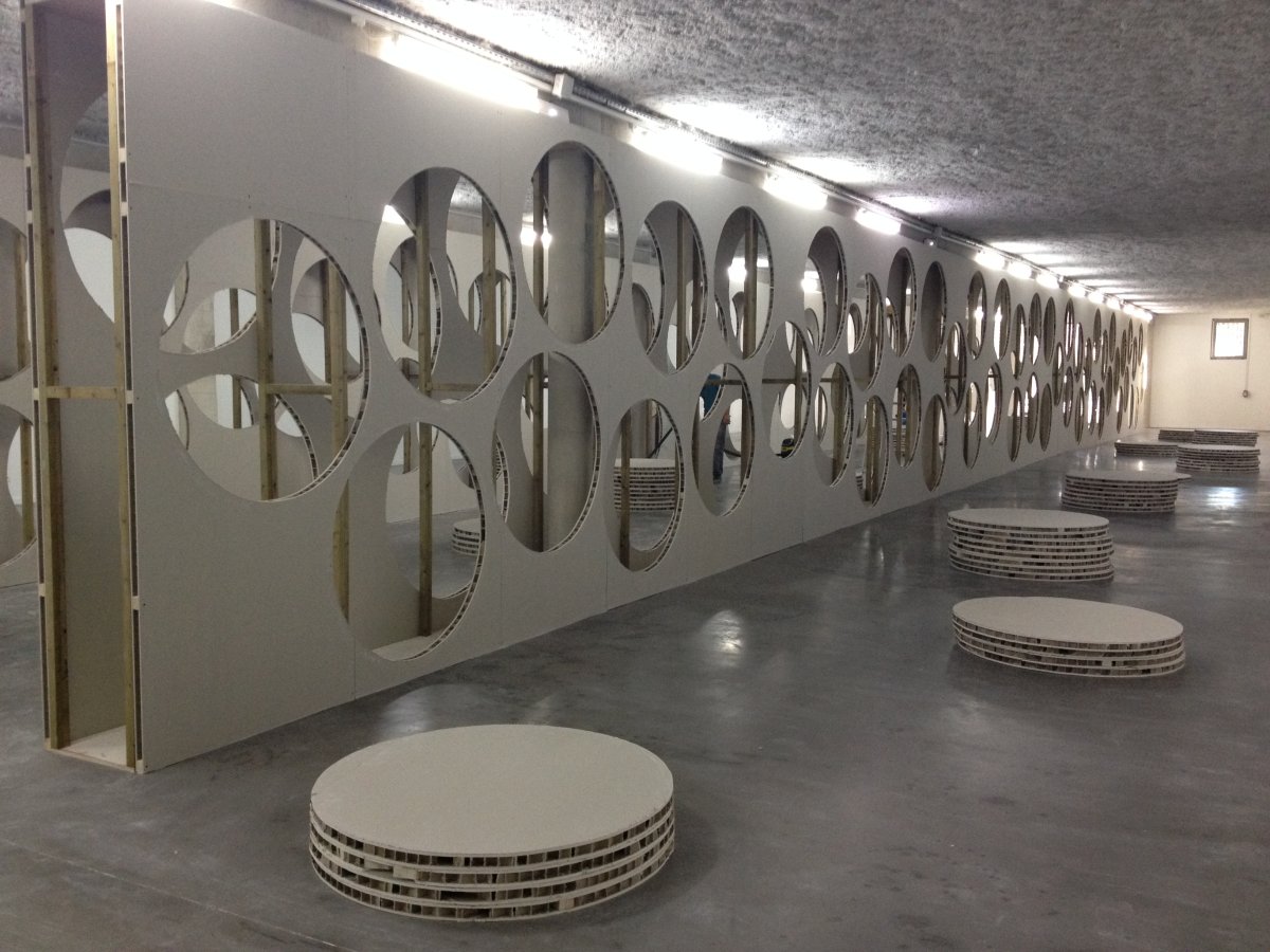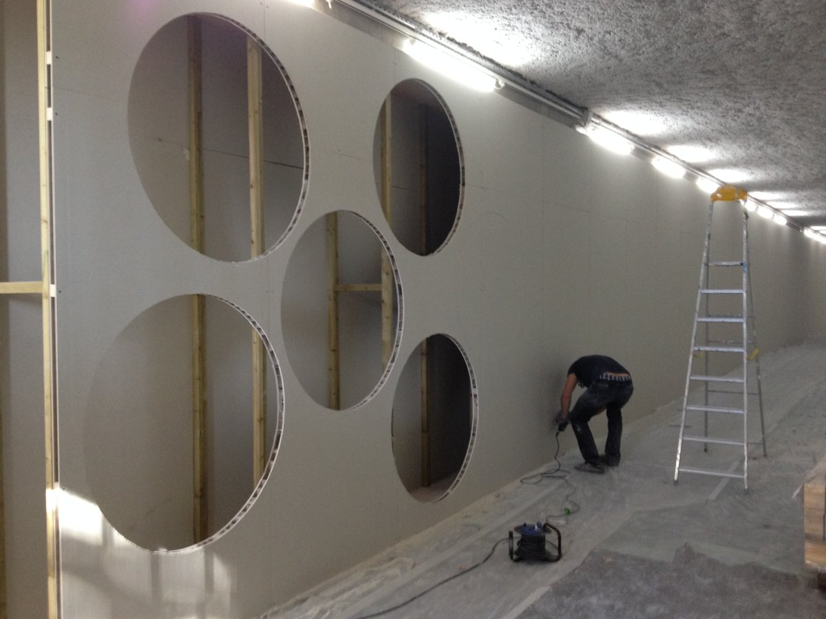 Montage des cimaises en panneau alvéolaire et tasseaux. Découpes sur l’ensemble des cimaises.