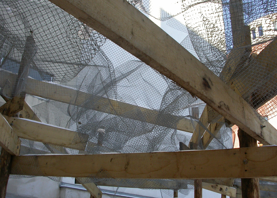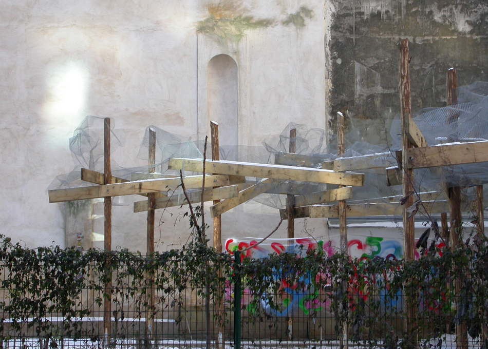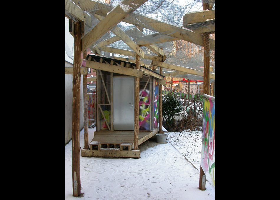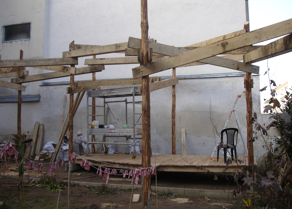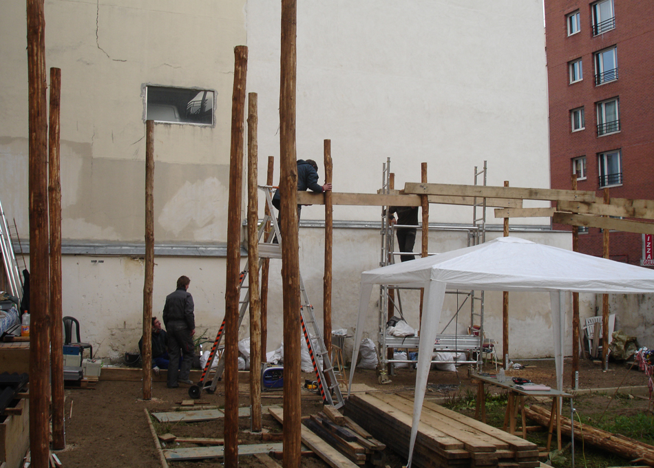 Construction d’une pergola et d’un abri de jardin à partir des dessins de l’artiste Yona Friedman et d’un cahier des charges établi par un bureau d’architecture. Réalisation des fondations, des ancrages et de l’ensemble de la structure en bois massif, Plexiglas et grillage.