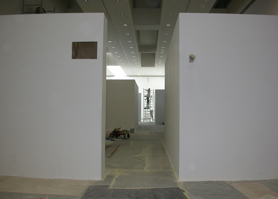 Construction, placage, enduits et mise en peinture des cimaises de l’exposition. Réalisation, installation et accrochage des œuvres.