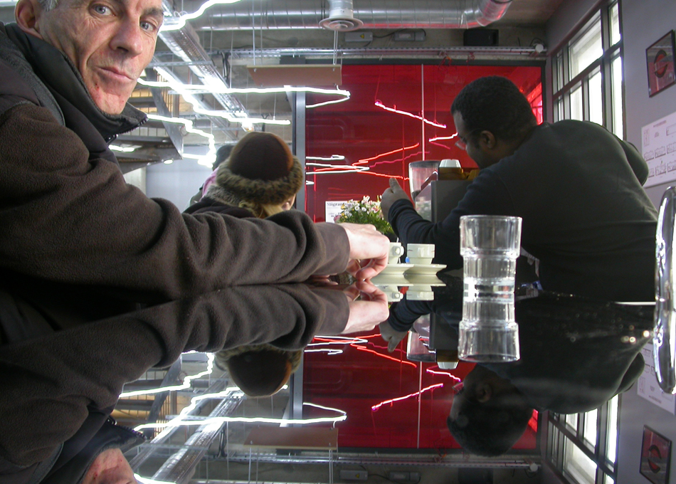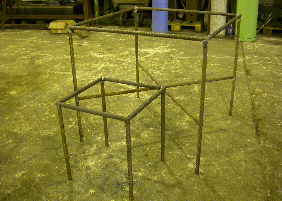 Réalisation et installation du mobilier conçu par l’artiste. Tables et tabourets en fers à béton soudés et métal poli. Bar en bois contreplaqué, palplanches en acier et métal poli.