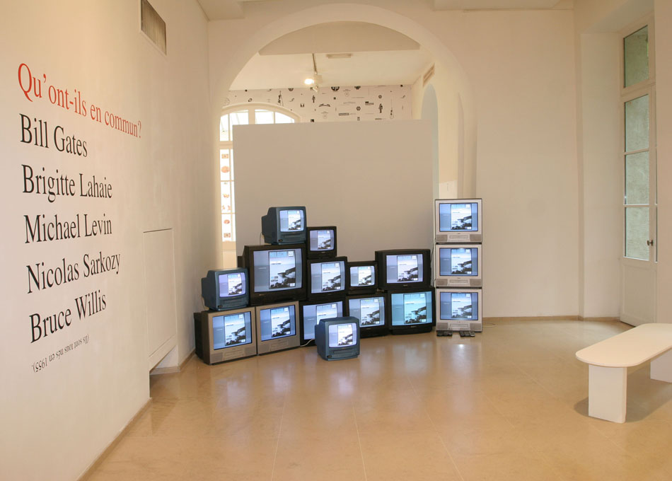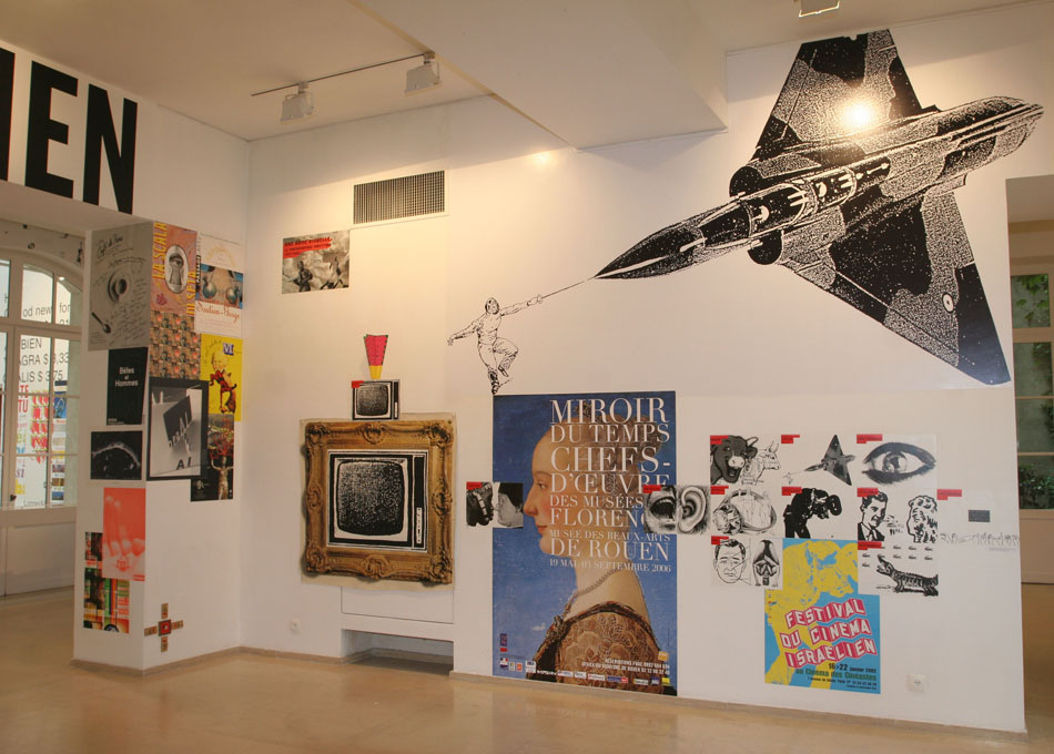 Collage de tapisseries et d’adhésifs sur l’ensemble des murs de l’exposition. Montage et accrochage des œuvres et des dispositifs.
